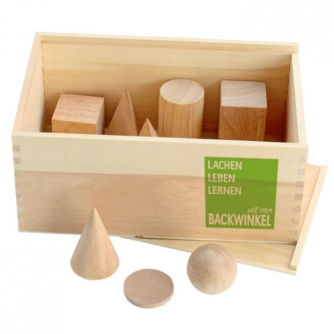 Geometrische Körper mit Grundflächen in der Backwinkel Holzbox.