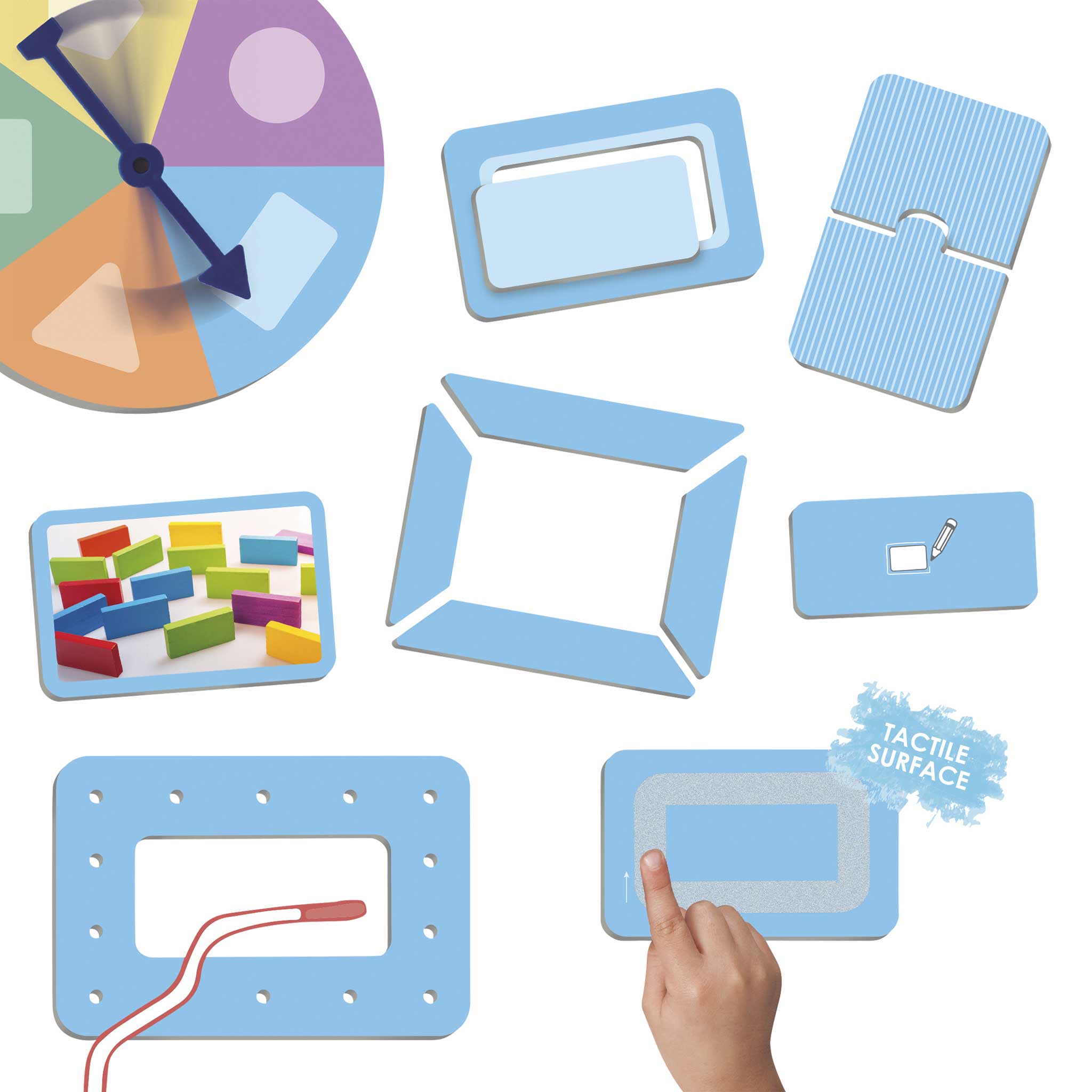 35 Aktionskarten (je 7 verschiedene Aktionskarten zu jeder geometrischen Figur, d. h.: 5 Karten mit Fotos der jeweiligen geometrischen Form, 5 Karten mit einfacher Passform zum Zusammenstecken, 5 zweiteilige Puzzlekarten, 5 mehrteilige Karten zum Zusammenbauen, 5 Karten mit teils rauer Oberfläche zum Ertasten, 5 Karten zum Zeichnen der Umrisse auf Papier, 5 gelochte Karten zum Durchfädeln der Schnüre)
