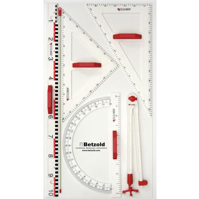 Die praktische Geräteplatte wird mit dem mitgelieferten Montagematerial direkt an der Wand befestigt. Daran finden alle Zeichengeräte ihren festen Platz, bleiben ordentlich sortiert und stets griffbereit. Die Tafelgeräte eignen sich ideal zum exakten Zeichnen von geometrischen Figuren, Linien, Winkeln, Schrägbildern und vielem mehr. Ein großer Vorteil ist der Handgriff an den großen Geräten: Er erleichtert die Arbeit erheblich, lässt sich dank Stecksystem schnell abnehmen.