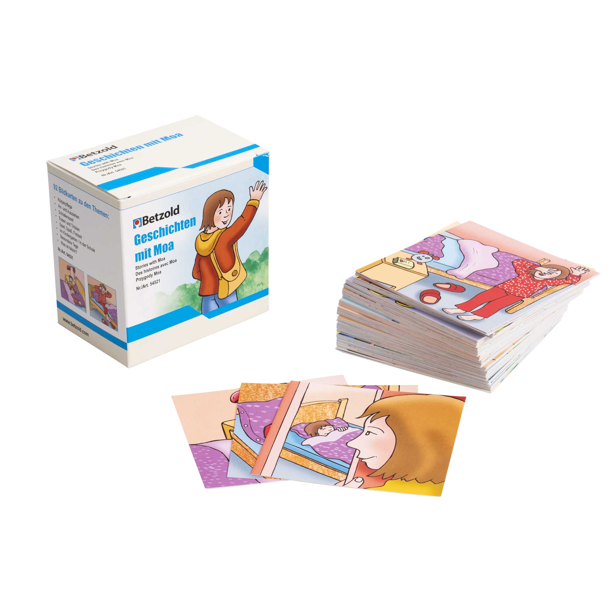 Die prägnanten Alltags-Szenen der Karten - wie z.B. An- und Ausziehen, Frühstücken oder Zubettgehen - regen Kindergarten und Grundschulkinder zum Erzählen an. Je nach Kombination der Bilder entstehen immer wieder neue Geschichten.