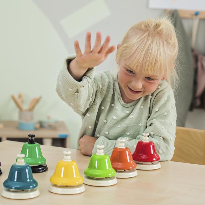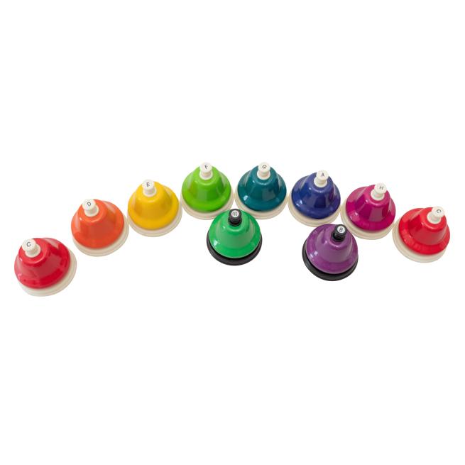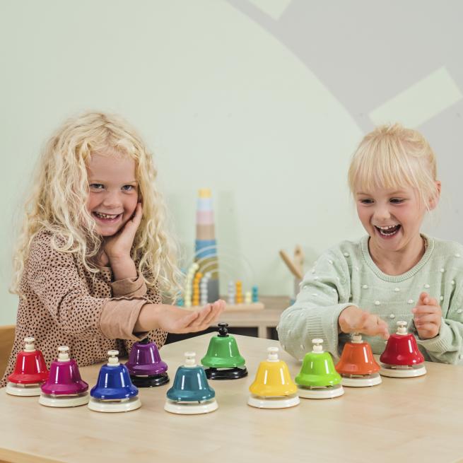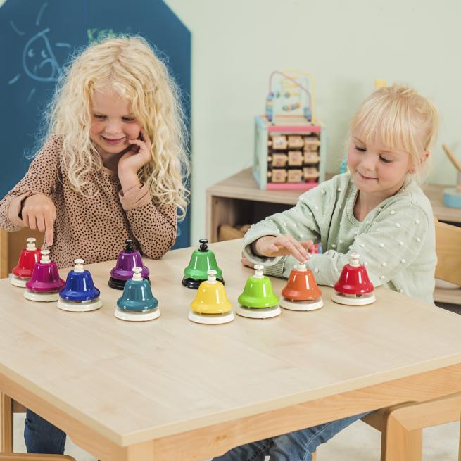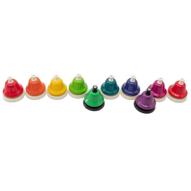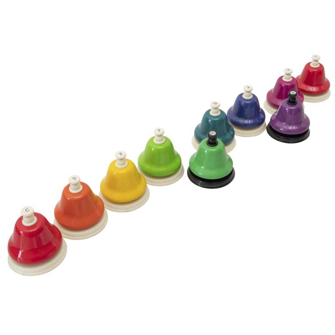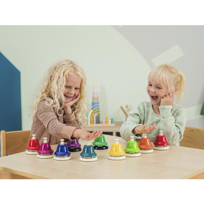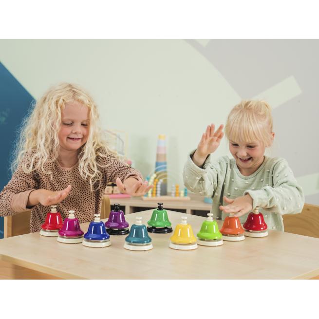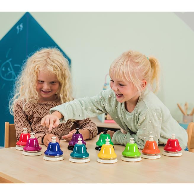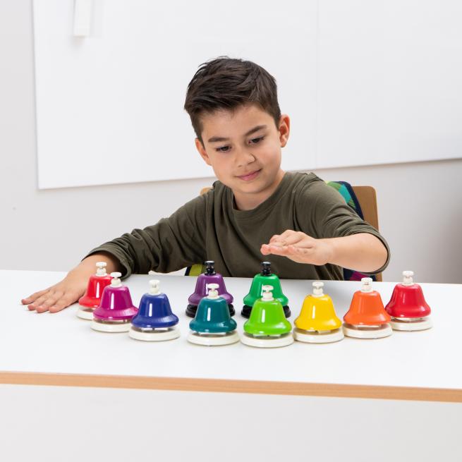 Mit den Schlagglocken aus Metall erzeugen Ihre Schüler reine Klänge nur mit der Hand. Die Sortierung in Farben ist hilfreich beim Notenlernen. Ihre Schüler spielen einfach bekannte Tonfolgen nach oder kreieren eigene Melodien. Schlagglocken eignen sich im Ensemble sehr gut für Effekte.