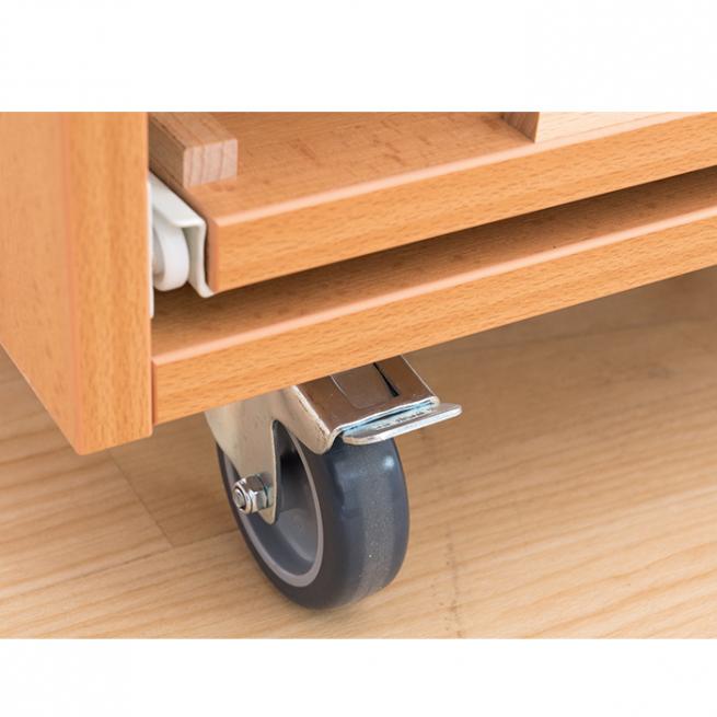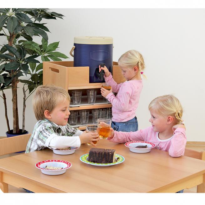 Dank kippfähiger Deckplatte in 2 Höhen, leeren Sie den aufgestellten Getränkebehälter einfach. Nachdem die Kinder sich selbstständig bedient haben, stellen sie ihre Becher auf die Tabletts. Getränkebehälter mit Ø 30 cm stehen verrutschsicher obenauf. Zwei der vier Rollen sind feststellbar und bieten festen Stand (Safti wird ohne Sonnenschirm, Isolierbehälter und Becher geliefert).
