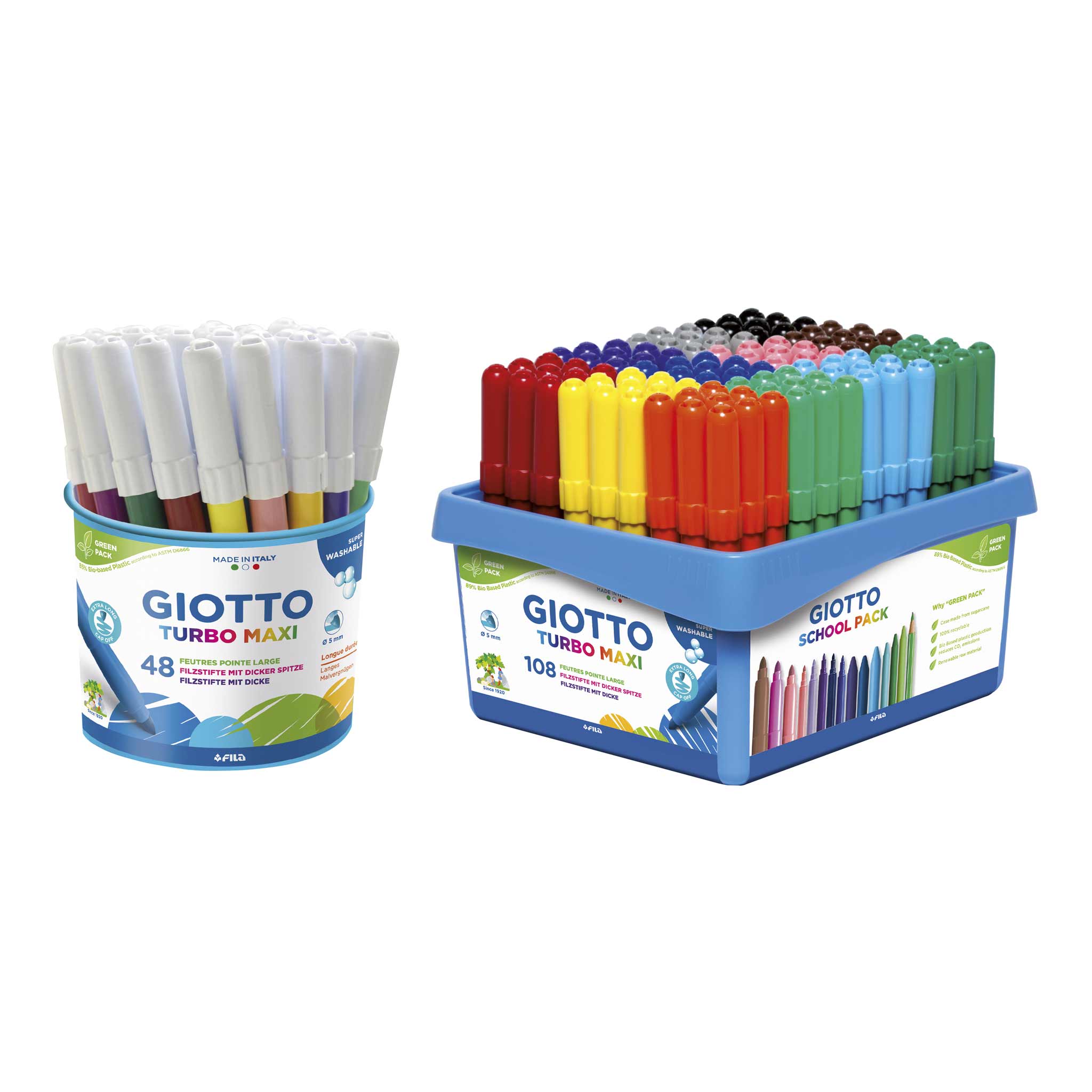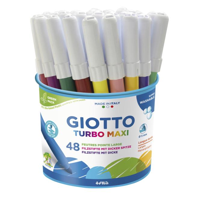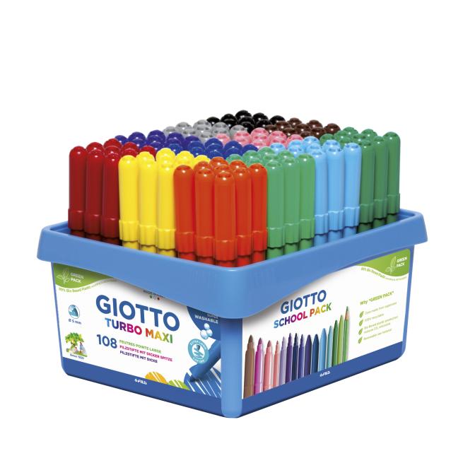 Die GIOTTO Fasermaler in 12 verschiedenen, strahlenden Farben überzeugen mit ihrer extradicken, eindrucksicheren Spitze (Mine: Ø 5 mm). Die Mine beinhaltet unbedenkliche Tinte auf Wasserbasis, so dass Textilien bei 40 °C in der Waschmaschine wieder sauber werden. Alle Stifte haben eine belüftete Kappe. Die Lieferung erfolgt in einer praktischen Kunststoffbox.