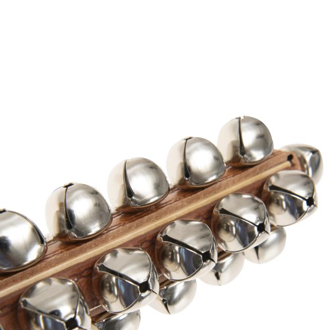 Holz und Kunststoff, mit 25 Glocken. Die vielen Glocken erinnern an einen großen Schlitten in einer verschneiten Landschaft.