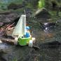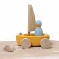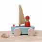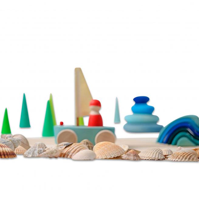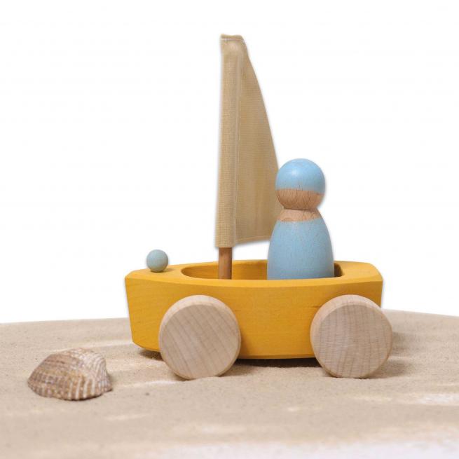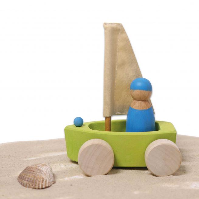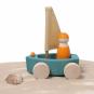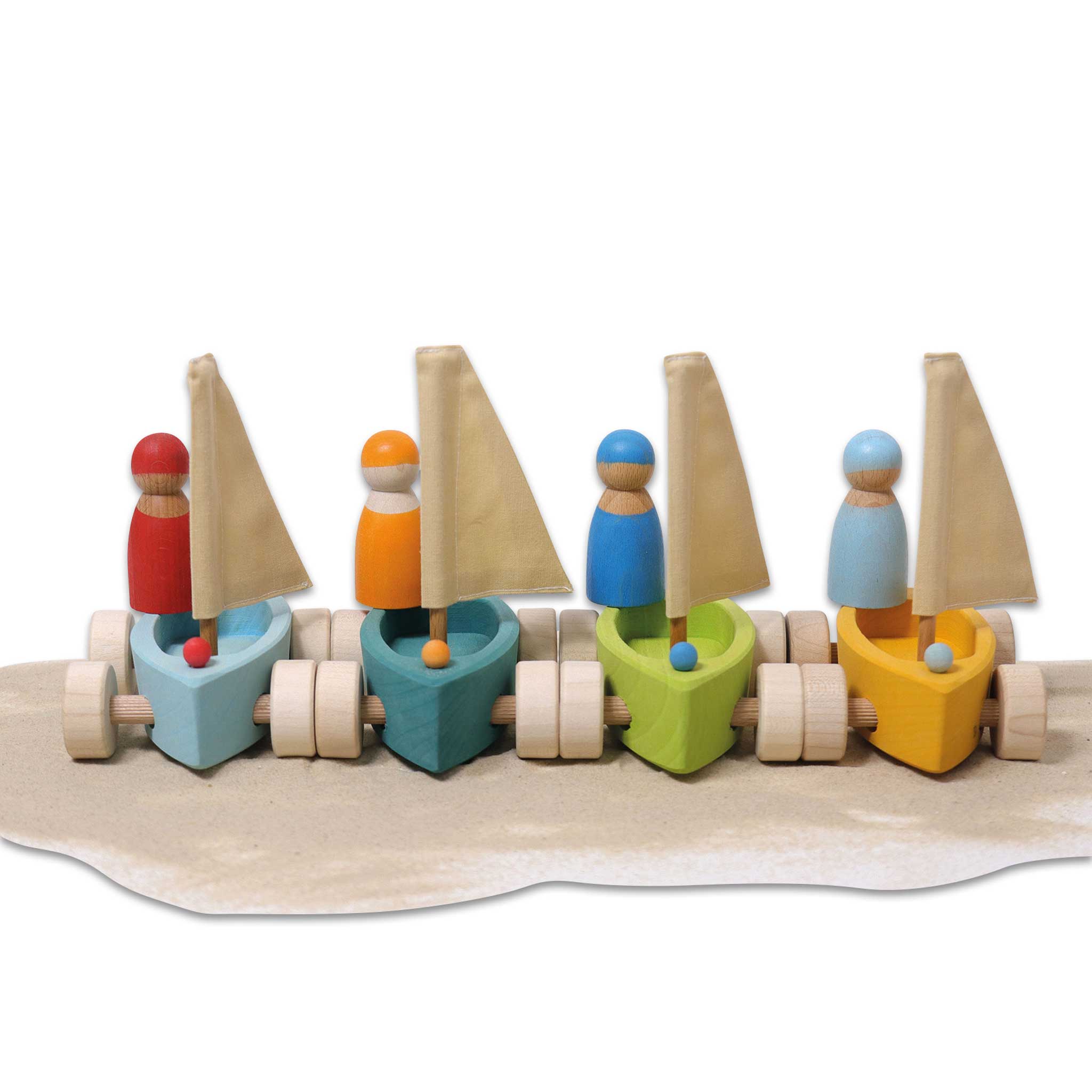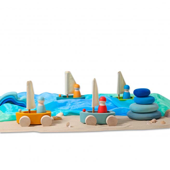 Ob Teppich-, Holz- oder andere Böden und sogar im Sandkasten – dank der geländegängigen Rollen starten Kinder mit den 4 Strandseglern zu jeder Regatta. Die Holzboote schwimmen auch im Wasser. Die griffigen Figuren bestehen aus unterschiedlichen Holzarten und sind wie die Boote in verschiedenen Farben handbemalt.