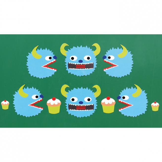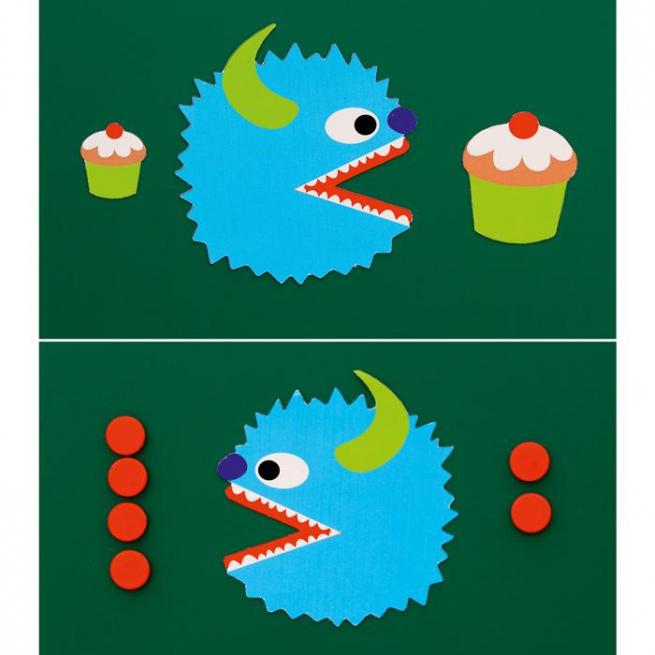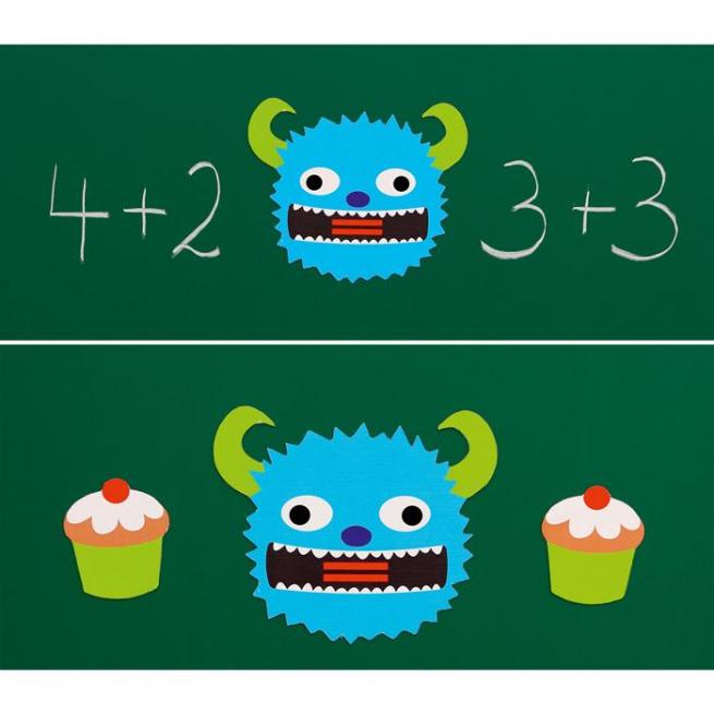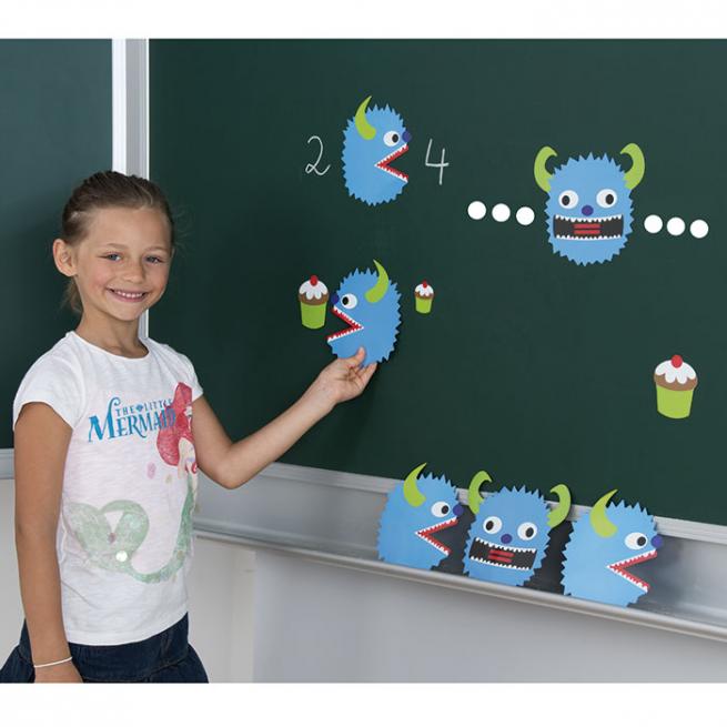 Die Unterscheidung zwischen dem Größer-als-Zeichen (>), Kleiner-als-Zeichen (<) und dem Gleichheitszeichen (=) wird mit den Monstern zum Kinderspiel. Die Zeichen sind bereits in roter Farbe in den Monstern integriert, sodass sie später auch ohne Monster wiedererkannt werden.