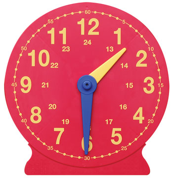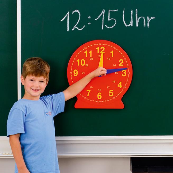 Die Uhr mit Ø 40 cm eignet sich hervorragend für die Wandtafel (Stahltafel). Denn Ihre Schüler erkennen die eingestellten Uhrzeiten problemlos von Ihren Plätzen aus. Die Zeiger bewegen Sie von Hand. Sie laufen synchron. Zum Arbeiten mit Gruppen stellen Sie die Uhr auf den Tisch. Dazu an der Rückseite einfach den Aufsteller ausklappen.