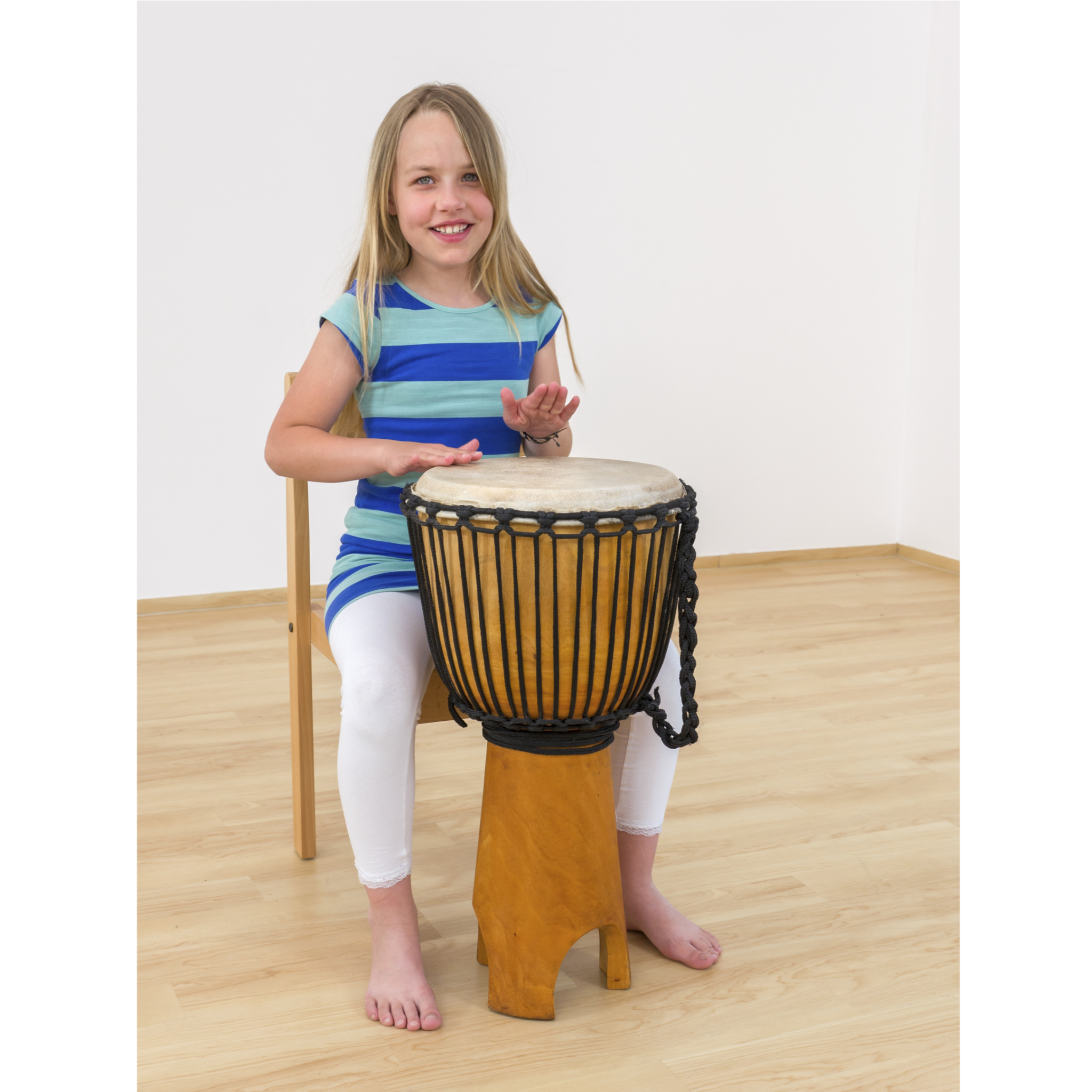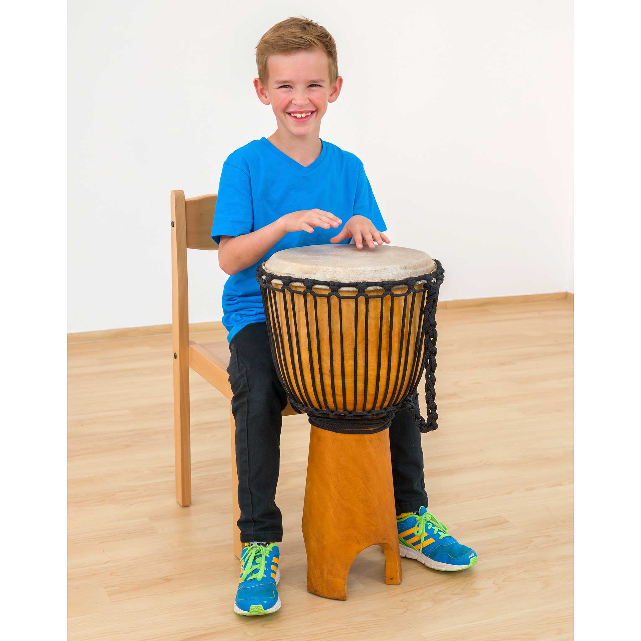 Ihre Schüler spielen diese Djemben im Sitzen. Dank der Aushöhlungen im Fuß der Trommel bleibt der volle Bassklang erhalten. Die Kinder sitzen bequem und konzentrieren sich ganz auf den Hand-Rhythmus. Das große Volumen der Klangkörper sorgt für ein reiches Klangspektrum mit kräftigen Bässen. Jede Djembe ist aus einem Stück Plantagen-Mahagoniholz gefertigt und mit Ziegenleder bespannt.