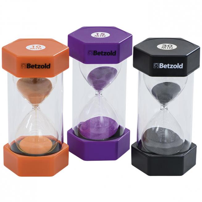 Was ist Zeit? Die großen, farbigen Sanduhren veranschaulichen die für Kinder abstrakten Sekunden und Minuten. Alle Uhren sind mit farbigem Sand befüllt und zeigen die Einheiten: 30 Sekunden, 1, 5, 10 und 15 Minuten an. Der innere Körper wird durch eine fest verschlossene Kunststoffröhre geschützt.