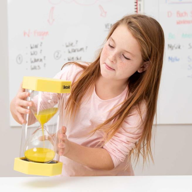 Was ist Zeit? Die großen, farbigen Sanduhren veranschaulichen die für Kinder abstrakten Sekunden und Minuten. Alle Uhren sind mit farbigem Sand befüllt und zeigen die Einheiten: 30 Sekunden, 1, 5, 10 und 15 Minuten an. Der innere Körper wird durch eine fest verschlossene Kunststoffröhre geschützt.