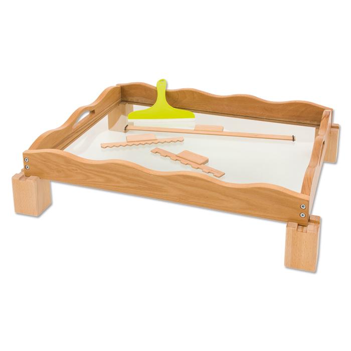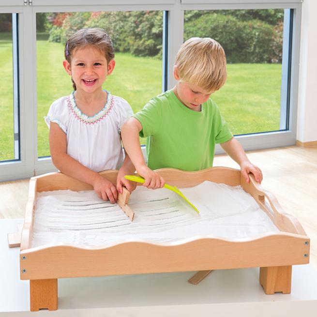 Kinder lieben es, mit den Fingern in der Sandwanne zu zeichnen. Vielfältige Übungen lassen sich mit der Sandwanne durchführen: freies Zeichnen und Malen, gezielte Schwungübungen oder Nachzeichnen von Buchstaben und Zahlen. Besonders im Stationsbetrieb beim Erlernen eines neuen Buchstabens oder einer neuen Zahl kommt die Sandwanne gerne zum Einsatz.