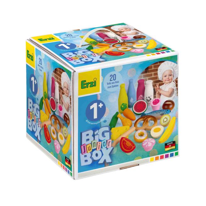 Die 20 Spiellebensmittel aus Buchenholz liegen gut in kleinen Händen und animieren zu Dialogen rund um Einkaufen, Zubereiten und Teilen. Dabei decken sie die wichtigsten Warengruppen ab: Getränke, Obst, Gemüse, Milchprodukte, Backwaren und Fleisch.