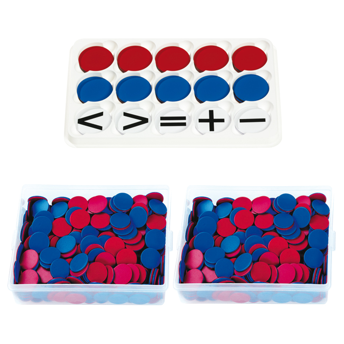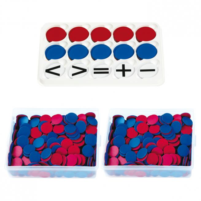100 magnetische Demonstrations-Wendeplättchen im Sortierkasten sowie 20 Rechenzeichen Ø 5 cm