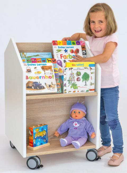 Robust, mobil und beidseitig nutzbar. Obere Fächer mit Acrylglasfenster, damit nichts hinausfällt und die Bücher gut zu sehen sind.
