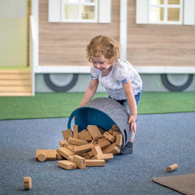 Der große Filzkorb ist ein hübscher Helfer, um Spielzeug, Bauklötze, Chiffontücher und vieles mehr platzsparend aufzubewahren. Mit seinem dezenten Design in Grau und Türkis fügt sich der Korb perfekt in jeden Raum ein.