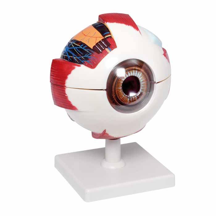 Für Ihre Schüler äußerst anschaulich: Außen am Augapfel sind die Muskelansätze sowie der Ansatz des Sehnervs zu sehen. Die Lederhaut ist gefenstert, damit Sie die äußere Struktur der Aderhaut zeigen können. Wenn Sie den Augapfel zerlegen, wird die gesamte Aderhaut sowie der Ansatz der Iris sichtbar. Glaskörper, Linse, Iris und Hornhaut sind herausnehmbar.