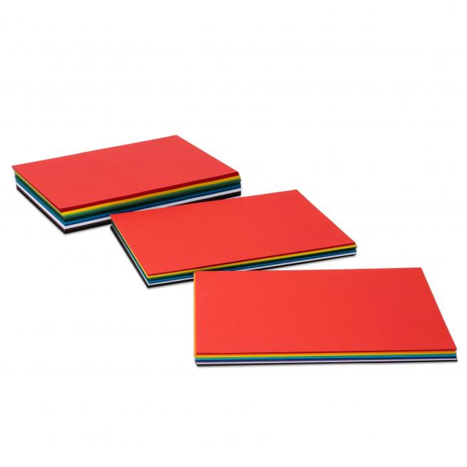 250 Bogen, 300 g/m², 50 x 70 cm, sortiert nach Bedarfshäufigkeit: - je 30x hochrot, bananengelb, tannengrün, weiß, schwarz, - je 20x weiß, hellgrün, schockobraun, pazifikblau, moosgrün