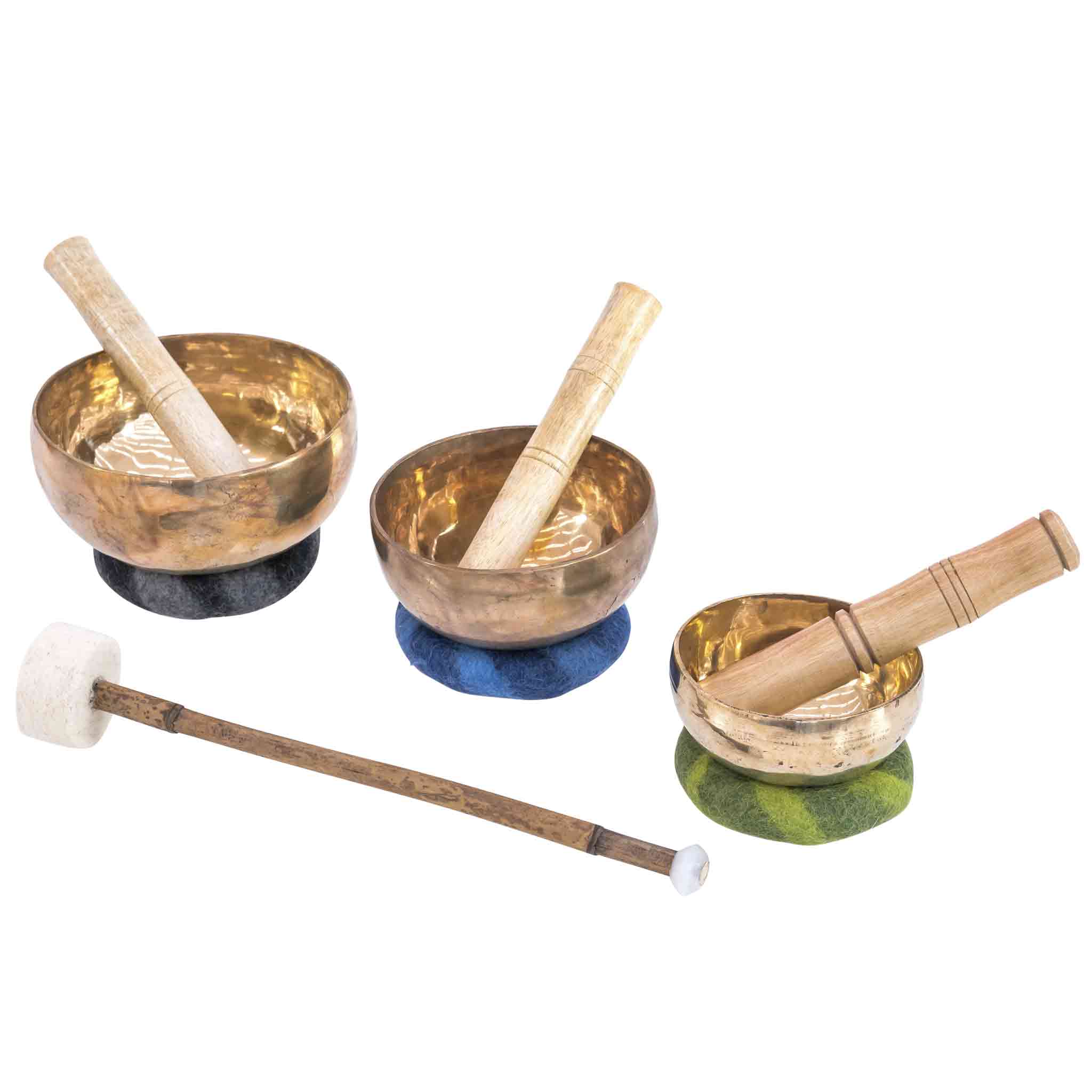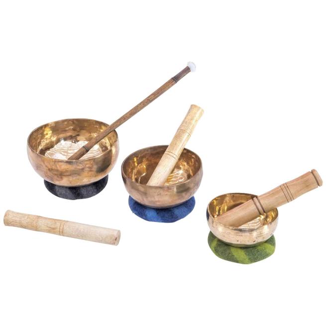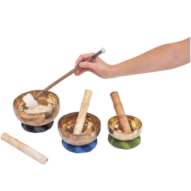Das Set besteht aus 3 Klangschalen inkl. Filzreifen (100 % Schurwolle) und 3 Klöppeln sowie einem gratis Filzklöppel mit Holzstiel.