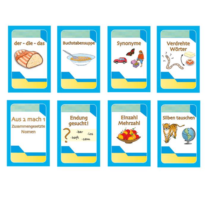 Bestehend aus Artikel, Einzahl Mehrzahl, Silben tauschen, zusammengesetzte Nomen, Buchstabensuppe, Endung gesucht, verdrehte Wörter, Synonyme und dem magischen Zylinder.