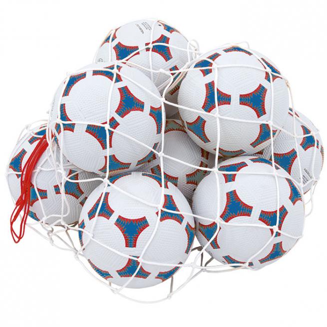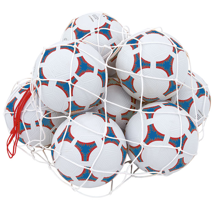 Ballnetz (Art.-Nr. 6866) aus 100 % Polypropylen mit 10 Schulhof-Fußbällen (Art.-Nr. 18583). Ab 4 Jahren.