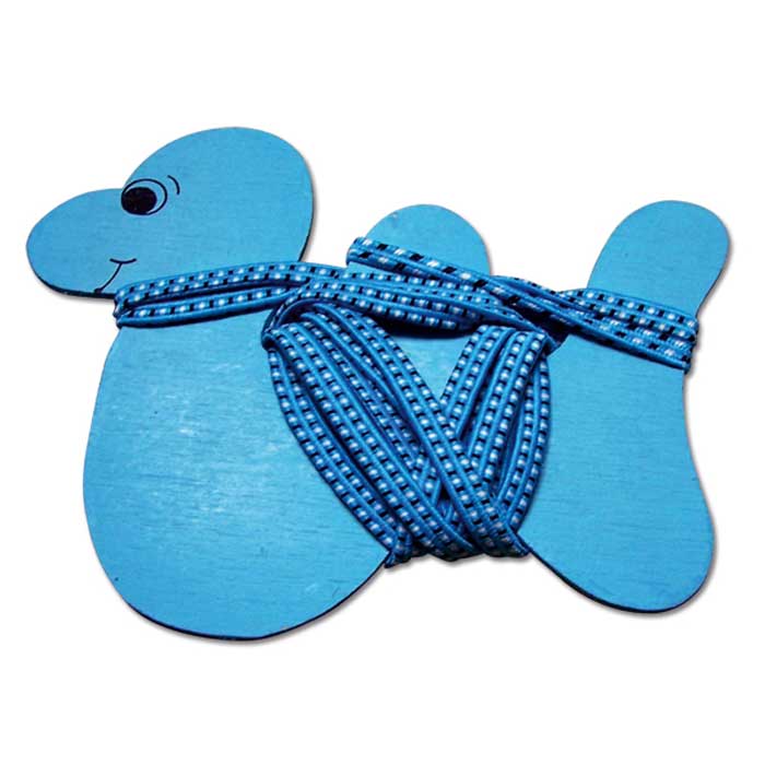 Farbiges Gummiband für zahlreiche Hüpfspiele. Schön und zweckmäßig: zur Aufbewahrung wird das Gummiband um die Holzfigur gewickelt – kein Verknoten mehr!
