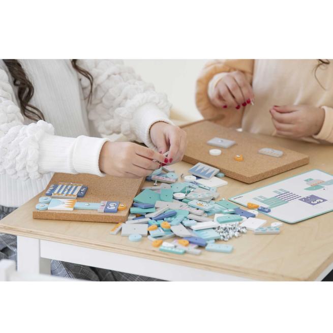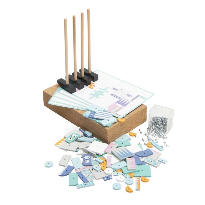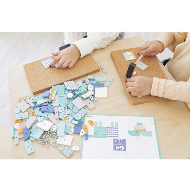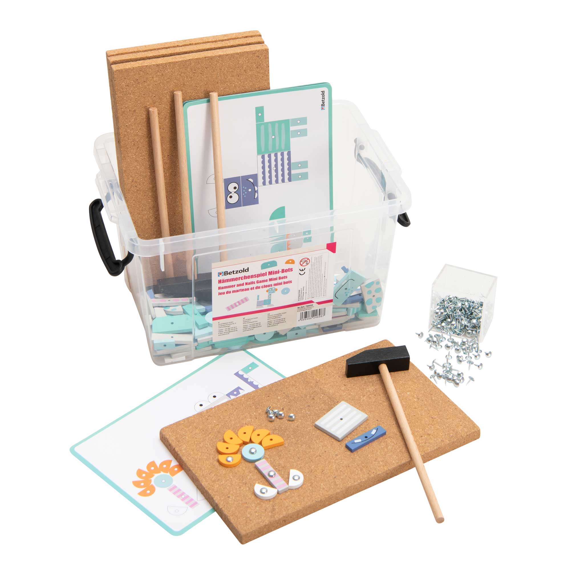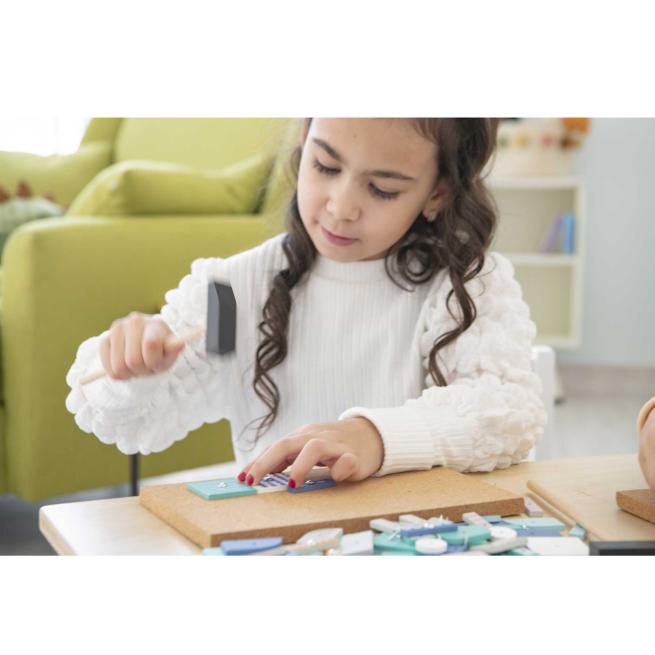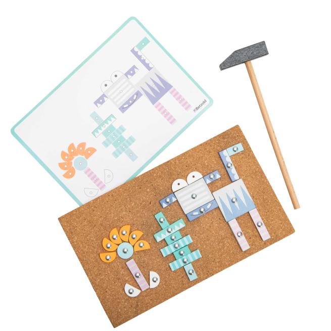 Das beliebte Geschicklichkeitsspiel fördert die kindliche Kreativität, Konzentration, Hand-Auge-Koordination und Feinmotorik. Koordiniert und konzentriert befestigen die Kinder die Mosaikformen auf der Korkunterlage, indem sie die Nägel durch die vorgebohrten Löcher in den Formen hämmern. Aus den enthaltenen Mosaikformen legen die Kinder unterschiedliche Vorlagen nach und entwickeln auch eigene Ideen für tolle Muster. Dabei experimentieren sie nicht nur viel, sondern entwickeln sogar nebenbei ein erstes Verständnis für geometrische Figuren und deren Spiegelungen. Ein tolles Geschicklichkeitsspiel für bis zu 4 Kinder gleichzeitig. Erhältlich in verschiedenen Ausführungen.