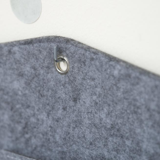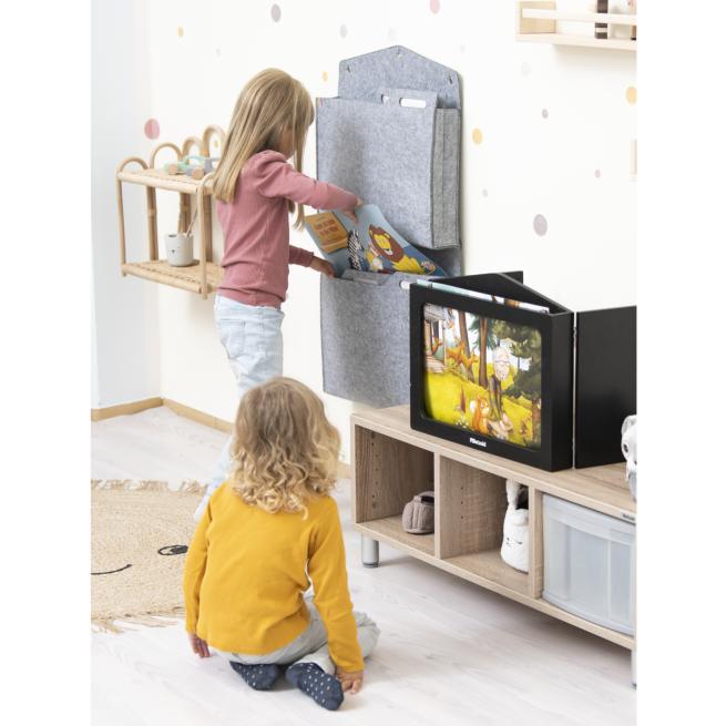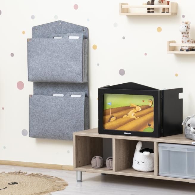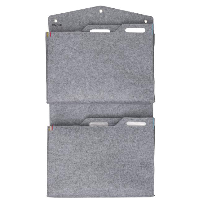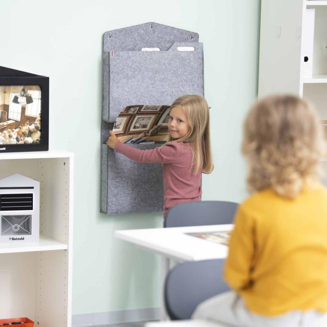Der Hängeorganizer ist mit seinen 2 Taschen und insgesamt 4 Fächern die optimale Lösung zum Aufbewahren von Papieren, Bildern oder Unterlagen bis DIN A3. Auch zur griffbereiten Unterbringung von bis zu 32 Kamishibai-Bildkarten-Sets ist der Hängeorganizer aus Filz bestens geeignet. So sind die Bildkarten gut geschützt und kindgerecht aufgeräumt. Zur einfachen Identifizierung des Inhaltes der einzelnen Fächer sind diese mit Beschriftungsfeldern ausgestattet. Dank der praktischen Metallösen hängen Sie den Hängeorganizer einfach an die Wand.
