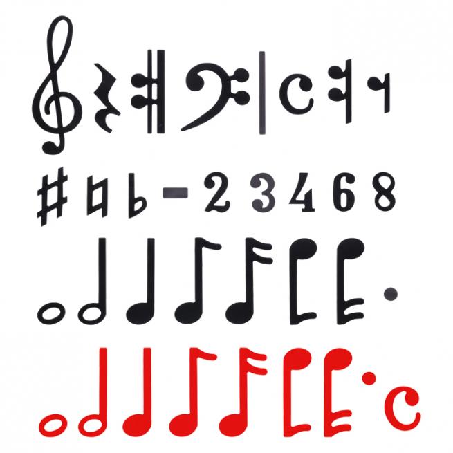 - Punkt: Ø ca. 1,6 cm<br/>Ganze Note: ca. 2,6 x 3,2 cm<br/>Achtel Note: ca. 8,8 x 5,5 cm<br/>Violinschlüssel: ca. 16 x 5,7 cm