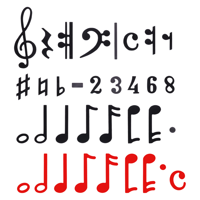 Noten und Zeichen aus stabilem Kunststoff. Dank magnetischer Rückseite für Stahltafeln geeignet. Für Norm-Notenlinien mit einem Linienabstand von 2,5 cm. 240 Teile im Sortierkarton.