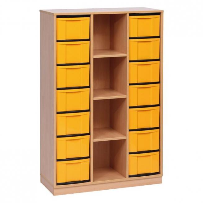 3-reihiges Regal mit 4 Fächern und 14 hohen Boxen
