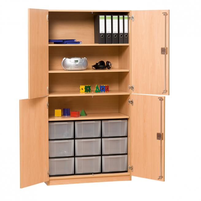 Dieses etwas schmalere Modell kommt ohne Mittelwand aus. Die Schranktüren haben je ein Sicherheitsschloss. Im oberen Schrankteil finden Sie 2 Böden, die in der Höhe verstellbar sind. Unten im Schrank sind wahlweise Kunststoffboxen oder 2 weitere Böden zu finden.