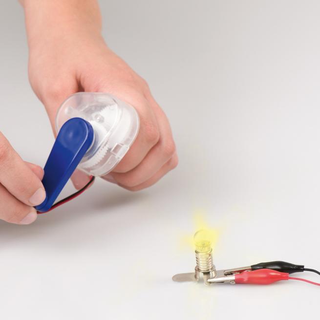 So einfach ist es, Strom zu erzeugen – aber auch der Dynamo wird mit einer Energie betrieben. Das Drehen der Handkurbel veranschaulicht dies hervorragend. Mit den beiden Krokodilklemmen schließen Sie das Gerät schnell und einfach an verschiedene Stromabnehmer an. Zusätzlich nutzen Sie den Dynamo bei vielen Experimenten als Batterieersatz.