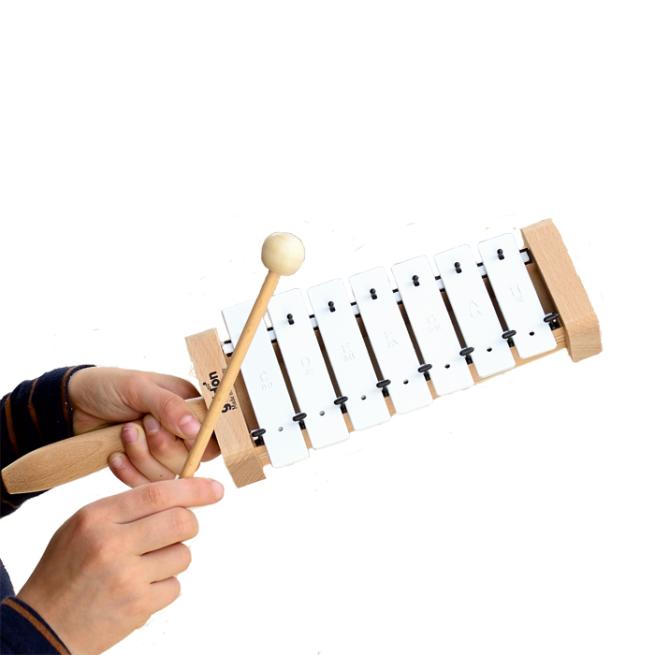 Hand-Metallophone eignen sich beispielsweise ideal für den Einsatz bei Schulaufführungen oder Theaterstücken. Rahmen und Griff sind aus Buche gefertigt. Der pentatonisch gestimmte Tonumfang umfasst d3 – e4.