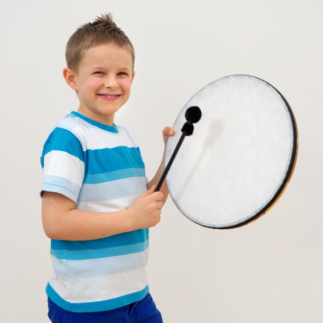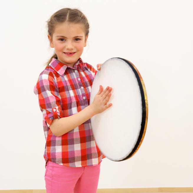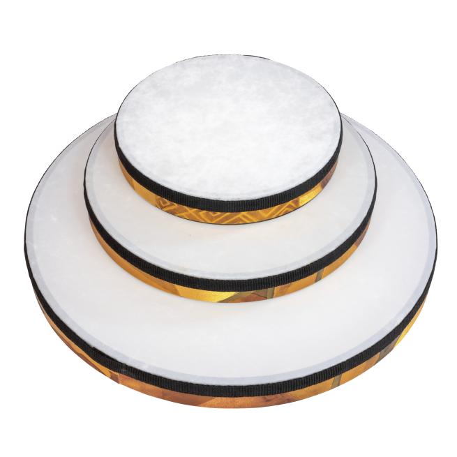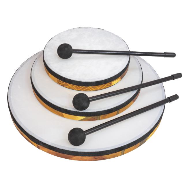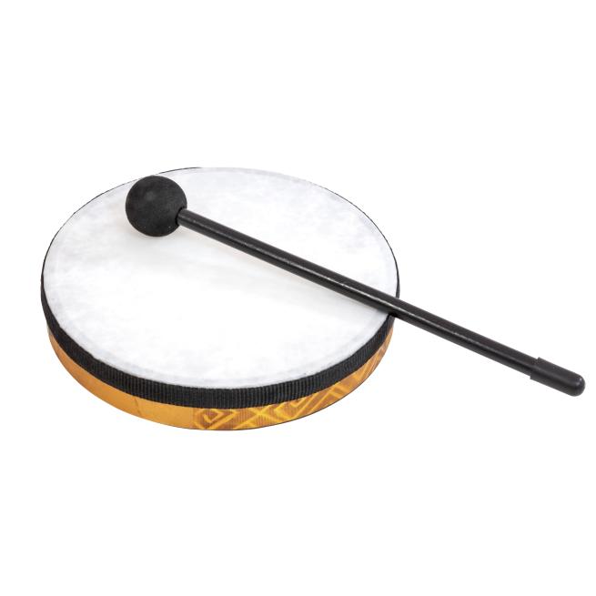 Auch die Handtrommeln mit Nylon-Fell bestechen durch das außergewöhnliche, golden strahlende Design. Die Instrumente werden entweder mit der Handfläche oder mit dem beiliegenden Schlägel gespielt.
