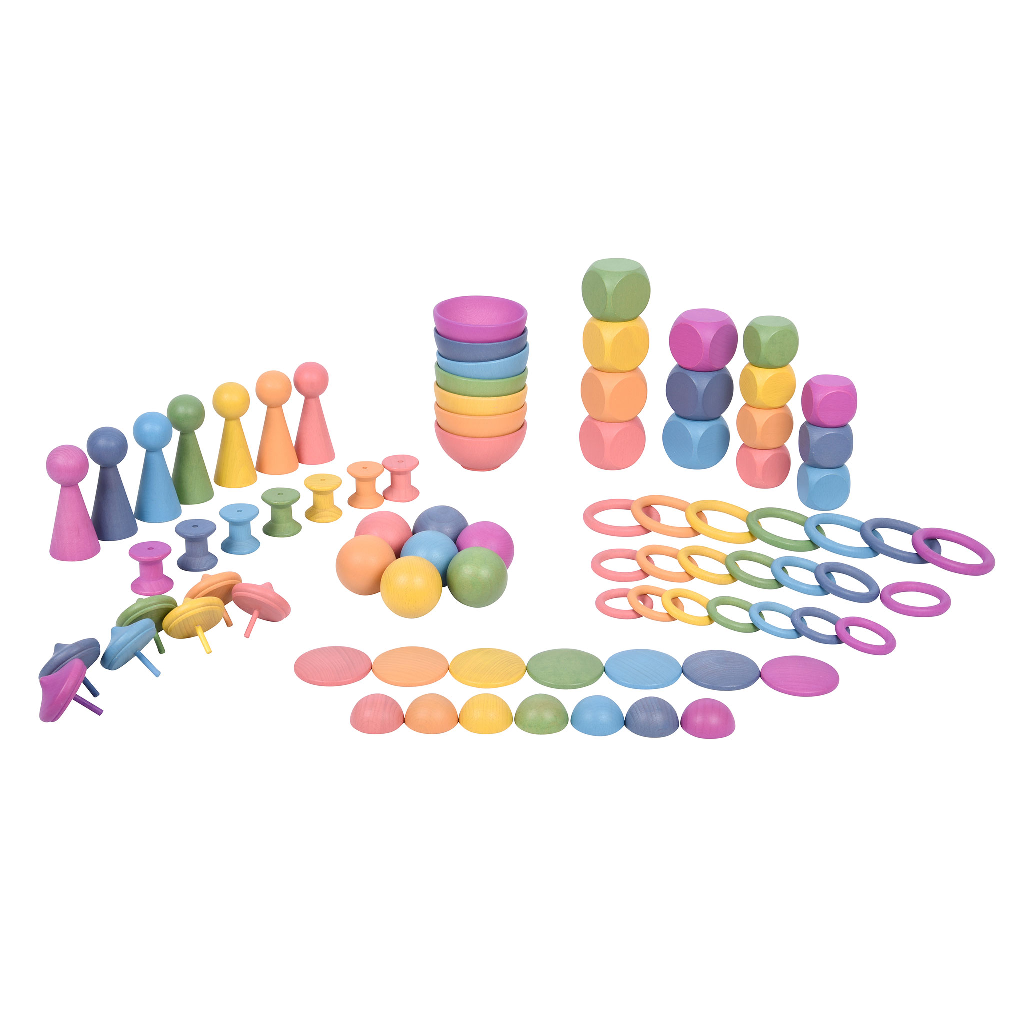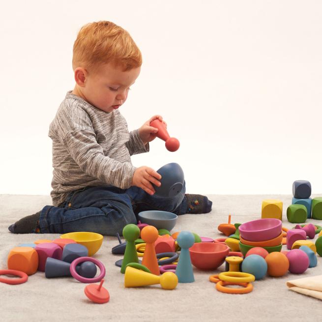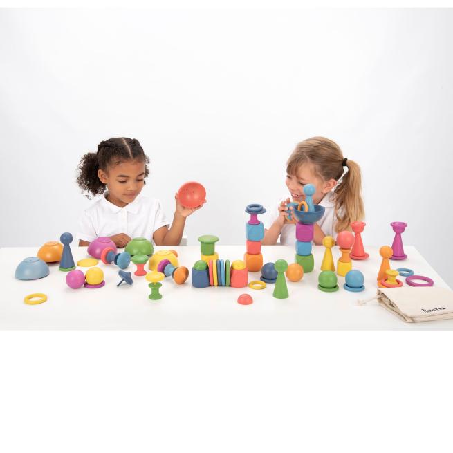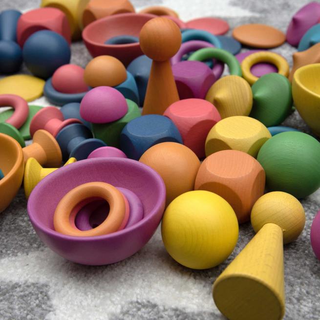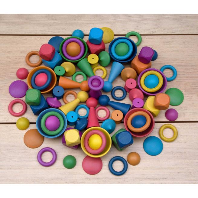Wie passt was zusammen, sodass tolle Bauwerke entstehen? Konstruieren, spielen, sortieren und zählen entdecken Kinder mithilfe der glatten Objekte aus Buchenholz. Dabei trainieren sie gleichzeitig ihr Geschick und logisches Denken. Das freie Spiel mit dem Sinnesmaterial in 7 unterschiedlichen Regenbogenfarben regt ihre Fantasie an. Zudem fördert das Material lösungsorientiertes Handeln.
