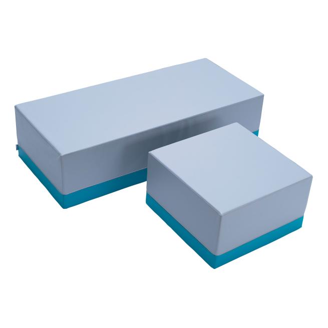Die Schaumfüllung hält alle Elemente stabil in Form. Oberseiten und Sockel sind mit pflegeleichtem Kunstleder bezogen. Die Oberseiten sind erhältlich in Grau und Beige, der Sockel ist wählbar in Braun, Hellblau, Petrol, Orange und Lime. Die Unterseiten sind rutschfest. Hocker- und Bank-Elemente sowie die Kuschelrolle sind in zwei Längen erhältlich. Alle Clubbo-XXL-Elemente bestehen aus Kunstleder, 100 % Polyester mit Polychlorid-Beschichtung (PVC) und Schaumstoff, 100 % Polyurethan (PU).