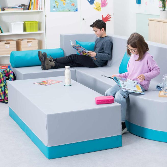 Die praktischen Baustein-Elemente der Clubbo-XXL-Serie passen Sie in bedarfsgerechten Kombinationen jeder Raumsituation an. So kreieren Sie auch auf kleinen Flächen bequeme Lese- und Sitzecken, z. B. in Pausen- und Gemeinschaftsräumen. Gestalten Sie beispielsweise durchgehende Sitzreihen aus Hocker- und Bank-Elementen oder Kombinationen mit dem Sofa. Mithilfe der platzsparenden Ecke auf quadratischer Grundfläche (73 x 73 cm) oder dem abgerundeten Viertelkreis-Hocker füllen Sie Raumecken. Die Hocker-Elemente eignen sich zugleich als Tische und lassen sich mit der Kuschelrolle ergänzen. Die jeweilige Sitzhöhe der gesamten Serie ist ideal für Kinder im Grundschulalter.