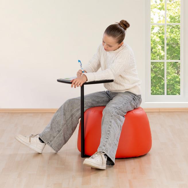Mit dem Hocker Muffin gestalten Sie flexible Lernorte für Klein und Groß. Damit werden Aulen, Aufenthalts- oder Klassen- zu Multifunktionsräumen für spontane Lernkreise oder Besprechungen in gemütlicher Runde. Der Hocker Muffin ist in einer Kinder- bzw. Erwachsenenausführung erhältlich, seine Tischablage ist drehbar. Darauf ist z. B. Platz für einen Laptop, ein Tablet oder Bücher. Auch zum Notizenmachen ist sie bestens geeignet. Dank der integrierten Füße ist der Hocker standfest. Die hinteren Bodengleiter schonen den Fußboden. Auf dem stabilen Holzgestell des Hockers Muffin sind die Seiten und der Sitz jeweils mit sehr formstabilem Schaumstoff gepolstert. Bezogen ist der Hocker mit hygienisch abwischbarem Kunstleder. Die Tischplatte besteht aus einer lackierten Mehrschichtplatte, die Füße aus pulverbeschichtetem Metall. Die Lieferung erfolgt teilmontiert. Füße, Tischplatte und Winkel für den Tisch werden beigepackt. Die einfache Montage nehmen Sie selbst vor.