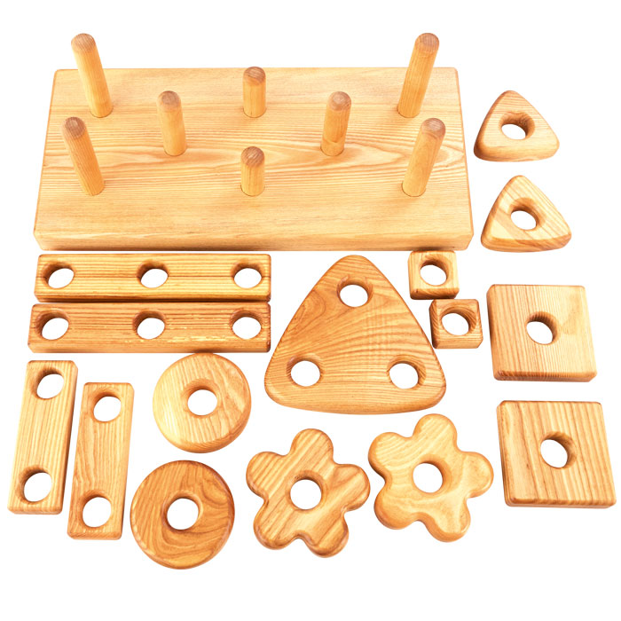 Die glatten, gut greifbaren unterschiedlichen Holzformen stecken Kinder auf die Stangen des kleinen oder großen Stapelblocks. So kombinieren sie ihre ersten eigenen Konstruktionen und fordern ihr Geschick. Das Holz ist mit natürlichem Leinöl behandelt.