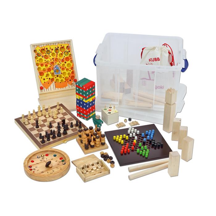 Abwechslungsreiches Spielvergnügen für die ganze Gruppe! Die Spielebox enthält 9 verschiedene Spiele aus Holz. Dazu gehören Klassiker wie Schach und Halma ebenso wie spannende Würfel- und Geschicklichkeitsspiele. In der praktischen, transparenten Box mit Deckel sind alle Spiele bestens aufbewahrt.