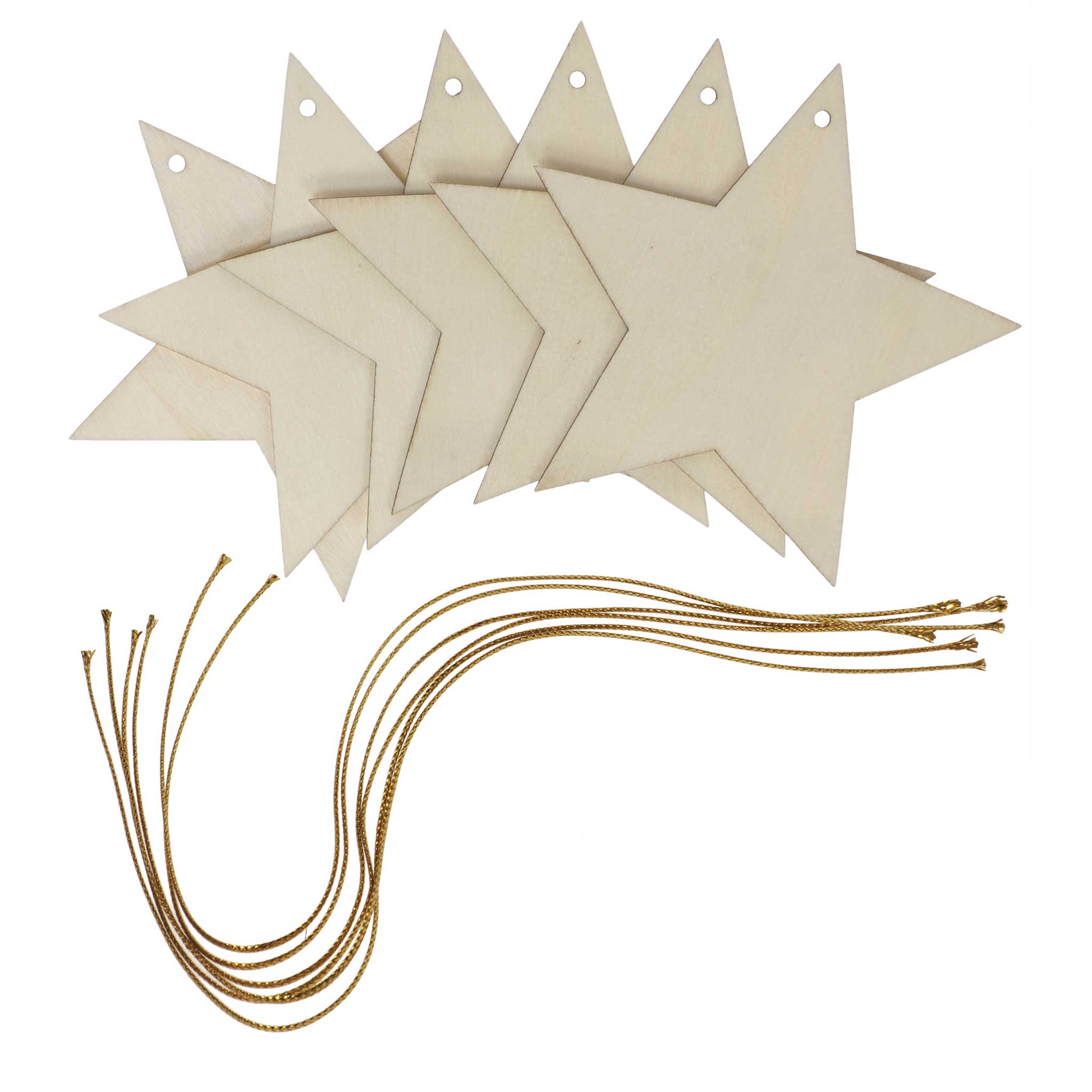 Ob Geschenkanhänger oder Baumschmuck – die Holzsterne gestalten Sie mit Ihren Kindern zu richtigen Hinguckern. Inklusive Fäden zum Aufhängen.