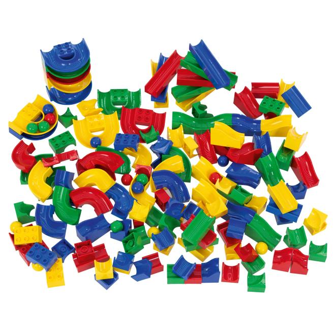 Erweiterungs-Set für die Hubelino-Kugelbahn. Gerade Bahnen, Kurven, Tunnel, Kehren, Kurvenrutschen und mehr – mit den gelben, roten, blauen und grünen Steinen aus robustem Kunststoff konstruieren Kinder noch rasantere Bahnen. Dabei trainieren sie gleichzeitig ihr logisches Denken und die Feinmotorik. Hundertprozentig kompatibel mit Noppenbausteinen anderer Hersteller.