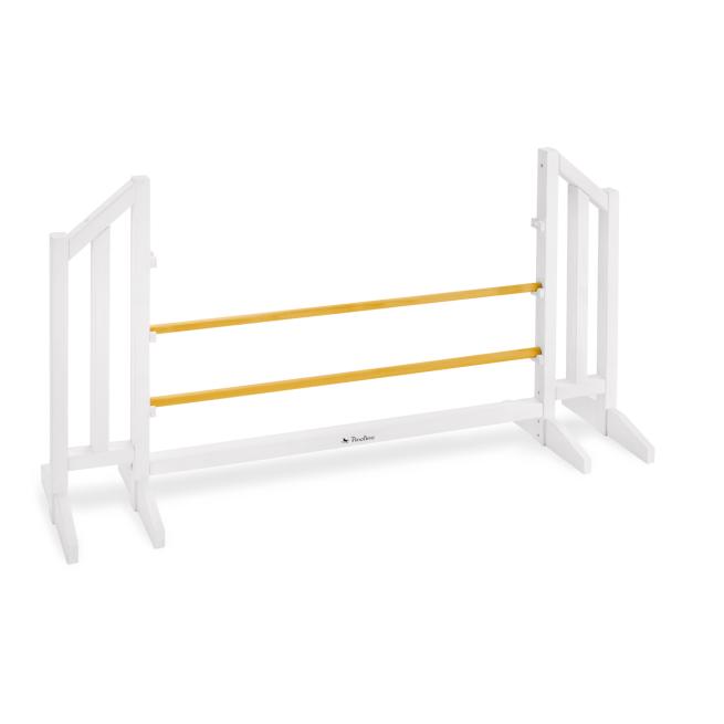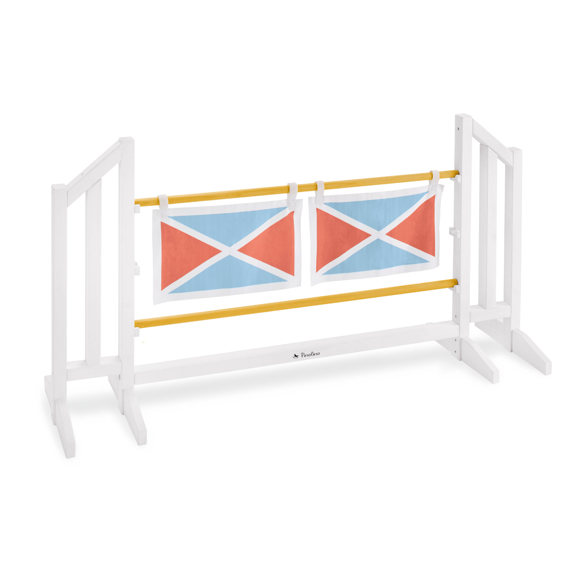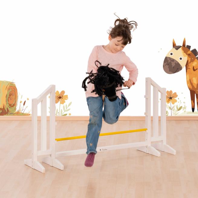 Die robuste Hürde aus vollmassivem Tannenholz hält intensivem Spielen stand und überzeugt durch ihre fröhliche Farbgestaltung. Abnehmbare Fähnchen setzen spielerische Akzente und machen jede Runde noch spannender. Als Hindernisparcours aus Holz für Kindergarten und Vorschule fördert das Set Teamgeist, Mut und Freude an Bewegung und bleibt lange im Einsatz. Ob im Rollenspiel rund ums Reiten oder als Bewegungsspielzeug für drinnen und draußen – das Hürden-Set Stormy passt sich Ihren individuellen Bedürfnissen ganz flexibel an.Inhalt: