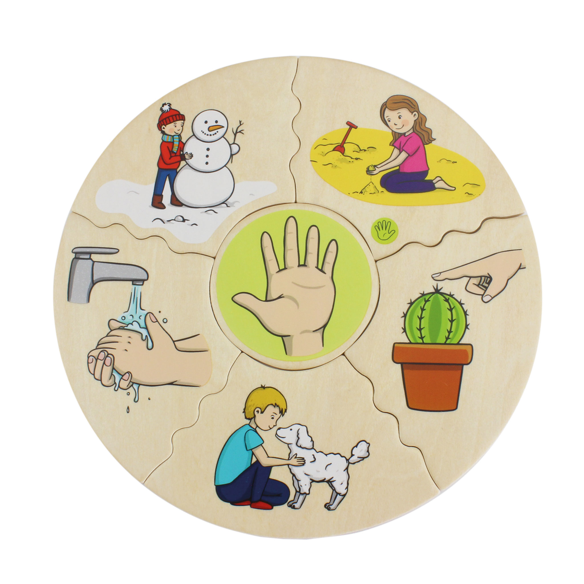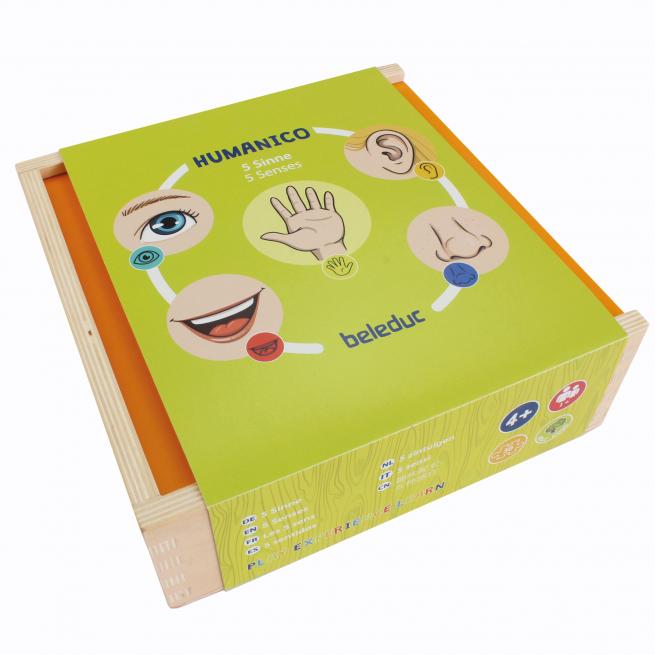 Sehen, Hören, Riechen, Schmecken und Tasten: Die 5 Holz-Puzzles in der Aufbewahrungsbox thematisieren je einen der 5 Sinne und ermöglichen Kindern spielerisches Lernen. Das Begleitheft liefert zusätzliche Informationen und Ideen.
