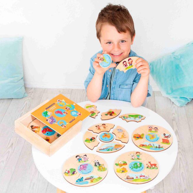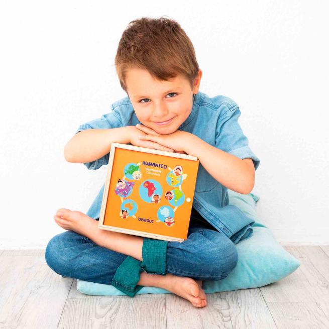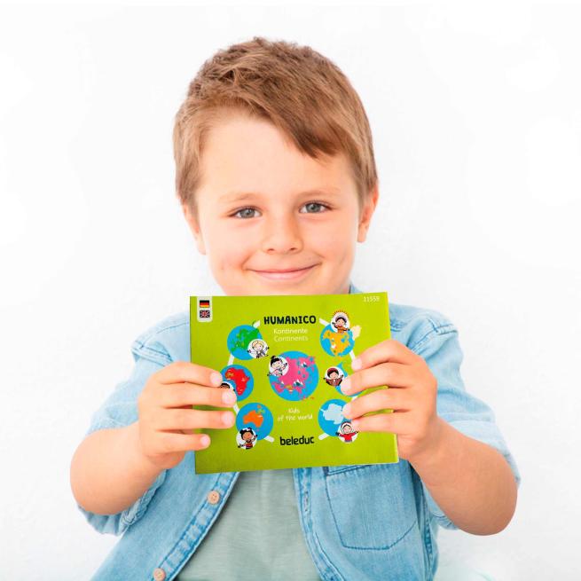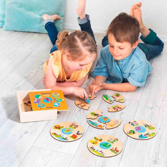 Das Set Humanico-Puzzle Kontinente vermittelt in fröhlichen Illustrationen altersgerechtes Grundwissen zu den Erdteilen. Die 6 bunten Puzzlekreise zeigen auf insgesamt 30 Teilen typische Tiere, Obst- und Gemüsesorten, Trachten und bekannte Orte der Kontinente Europa, Afrika, Asien, Nordamerika, Südamerika und Australien. Im beiliegenden Infoheft ist außerdem spannendes Wissen zur Antarktis enthalten. Es gehören immer 5 Teile zusammen, das runde Mittelstück zeigt dabei den jeweiligen Kontinent in seinem Umriss sowie in einer je eigenen Farbe. Dies unterstützt die Kinder beim visuellen Lernen und hilft ihnen, die einzelnen Erdteile beim Spielen schneller wiederzuerkennen.