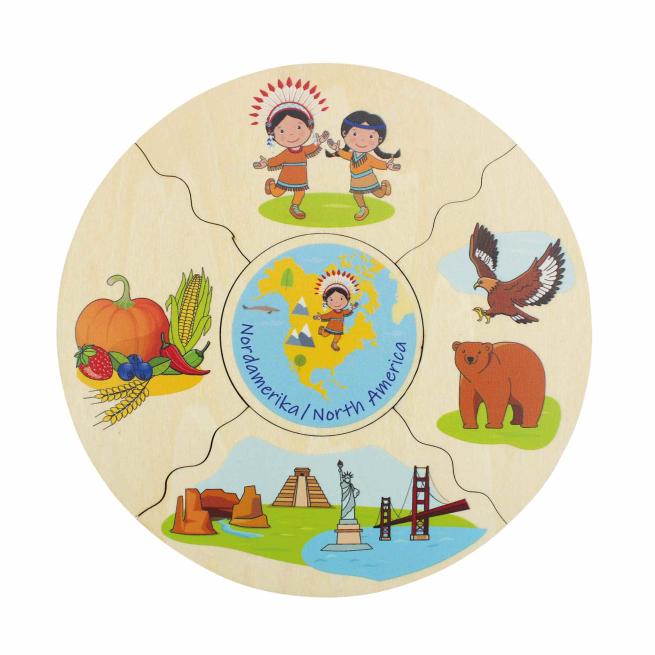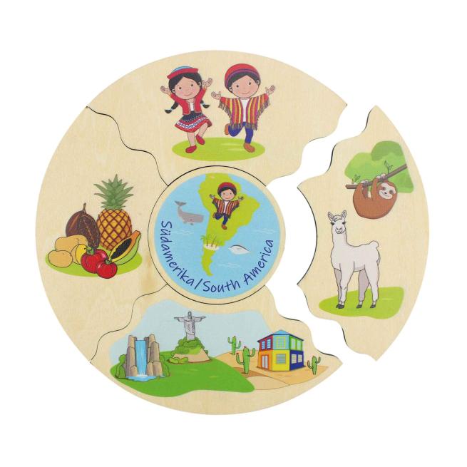 • 30 bunte Puzzleteile aus Holz• fröhliche Illustrationen zeigen Typisches aus Tierwelt, Obst, Gemüse, Kleidung und Sehenswürdigkeiten der Kontinente