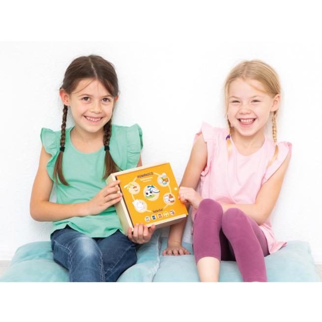 Alle Teile sind abgerundet und aus robustem Sperrholz gefertigt. Eine kompakte Holzbox mit Schiebedeckel dient dem sicheren und platzsparenden Verstauen.