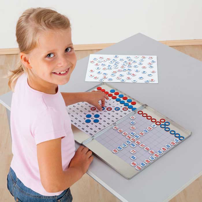 Ihnen stehen wahlweise das Blanko-Feld oder die Blanko-Hundertertafel zur Verfügung. Die Magnete haften gut auf den Feldern. Dadurch bleibt immer alles am richtigen Platz und kann nicht mehr verrutschen. Zum Lieferumfang gehört eine Sortierplatte auf der die magnetischen Plättchen und Ringe ebenfalls haften. Der sichere Ort für nicht benötigte Plättchen. Mit der Sortierplatte kann auch die nicht benötigte Tafel abgedeckt werden.