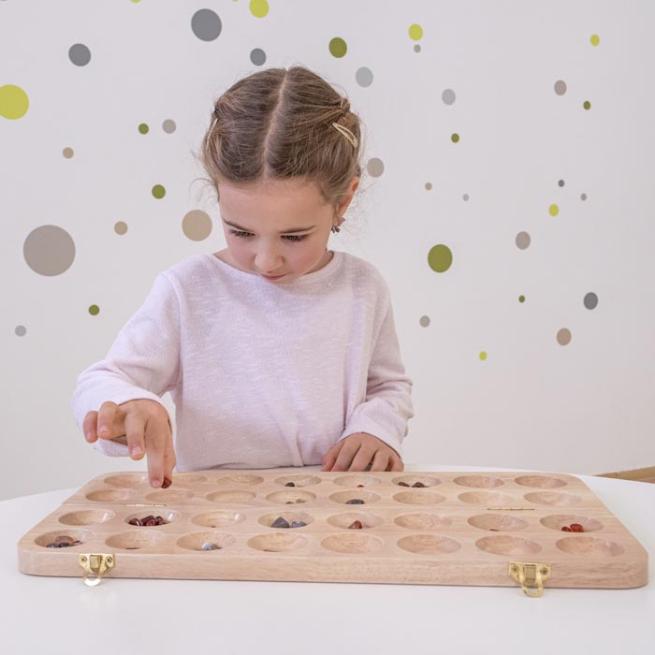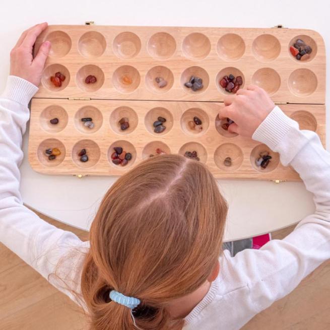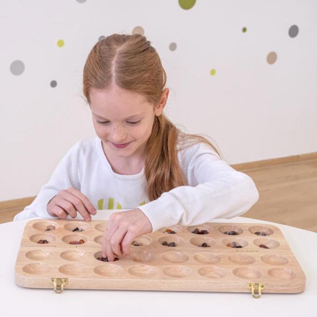 Beim HUS Steine-Spiel sind die Feinmotorik und strategisches Geschick gefragt. Die insgesamt 68 Glasnuggets verteilen 2 Spielende in den Mulden wieder um. Wer dabei die meisten Nuggets sammelt, gewinnt. Logisches und vorausschauendes Denken ist dabei besonders wichtig. Der Sortiervorgang fördert zudem erste mathematische Fähigkeiten fürs Zählen, Rechnen und Bilden von Mengen. Die abgerundeten Ecken und die ausgeformten Mulden unterstützen die Haptik. Ab 5 Jahren.