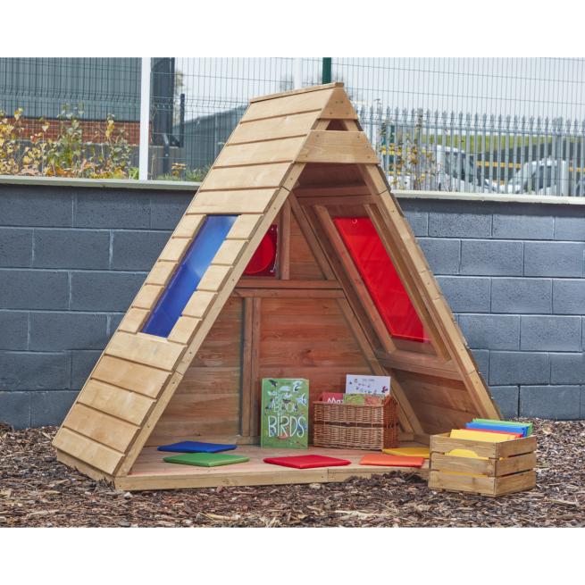 Die größten Fensteröffnungen des Häuschens befinden sich an den schrägen, nach oben spitz zulaufenden Dachseiten. So schauen die Kinder auch im bequemen Liegen nach draußen und in den Himmel. Natürlich lässt sich auch die direkte Umgebung des Häuschens beobachten und hierbei allerhand Spannendes entdecken! Einfach ideal zur Verbesserung von Raumwahrnehmung und Auffassungsgabe.